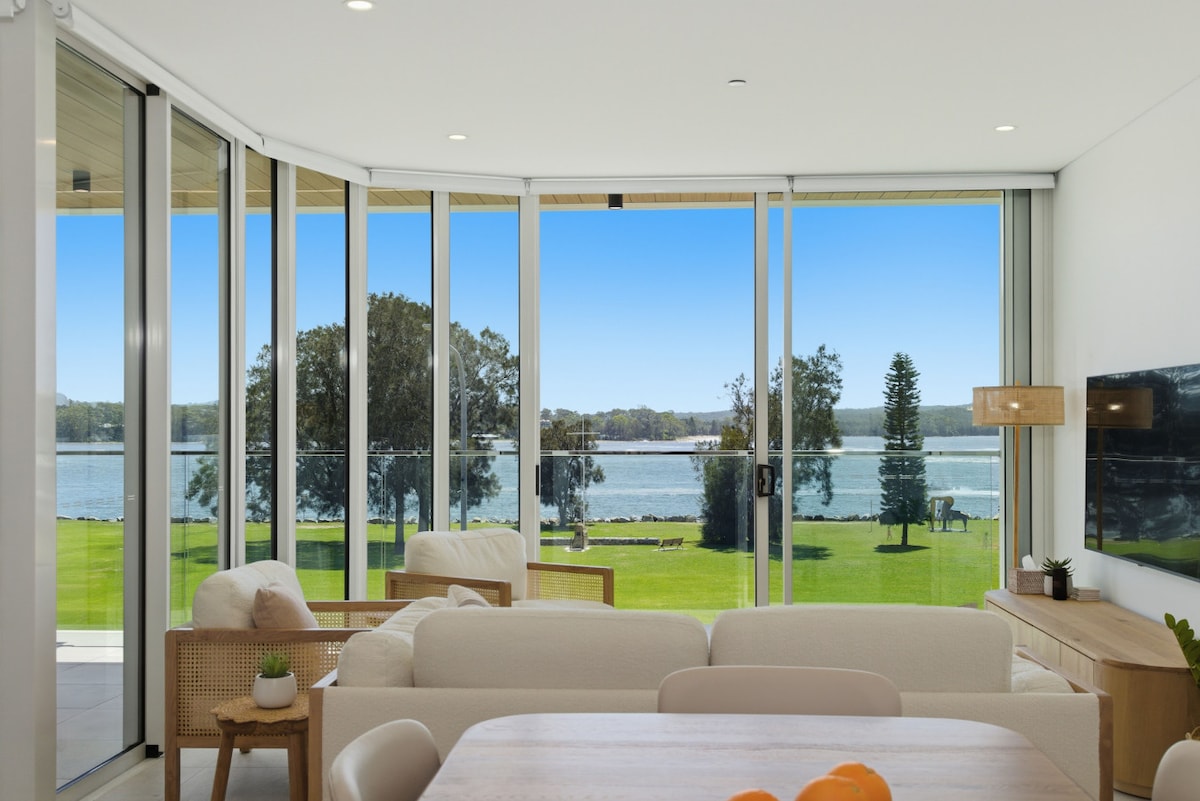 River front living in luxury. Temporarily anchor a boat out front of this waterfront home this summer. This magnificent duplex located on the Clyde river is a fantastic getaway from busy city life. Open floor plan living, dining and kitchen areas are located at the front of the complex surrounded by glass to capture the 180 degree views of the bay. The front main balcony provides stunning panoramic bay views for outdoor entertaining, and rear yard with a garden and backyard, outdoor shower.