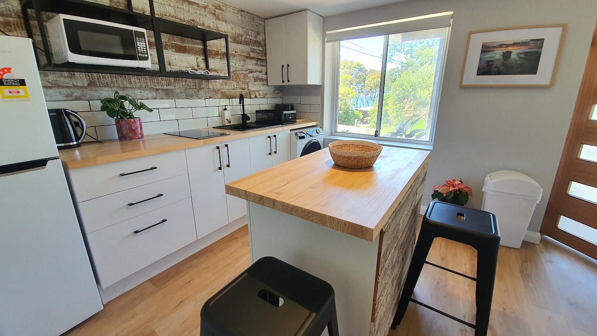 A private, self contained studio for 2 close to Sunshine Cove. The studio is open plan with outdoor seating. There is a small kitchenette with a microwave/ kettle/toaster, fridge an electric wok, air fryer and a single portable induction cook top. Outside BBQ. Unlimited internet. Pool available during the summer months and tennis court open all year round. Close to Beaches and Cafes around the Batemans Bay area.
