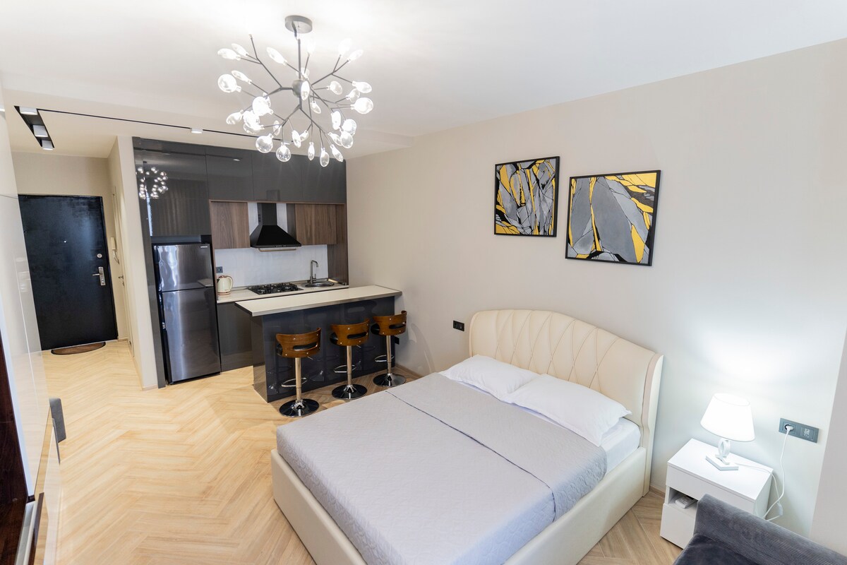 This beautiful contemporary studio flat is just 2 minutes walk from the city's cleanest beach, 5 minutes walk from city central square and all touristic areas, cafes and restaurants. King sized bed with all glass window for nocturnal sky and city gazing. The kitchen is fully equipped with everything you will need. It's wonderfully quiet and secured with high security systems. There is a bike hire station just 20 seconds away, perfect for a cycle along Batumi Boulevard.