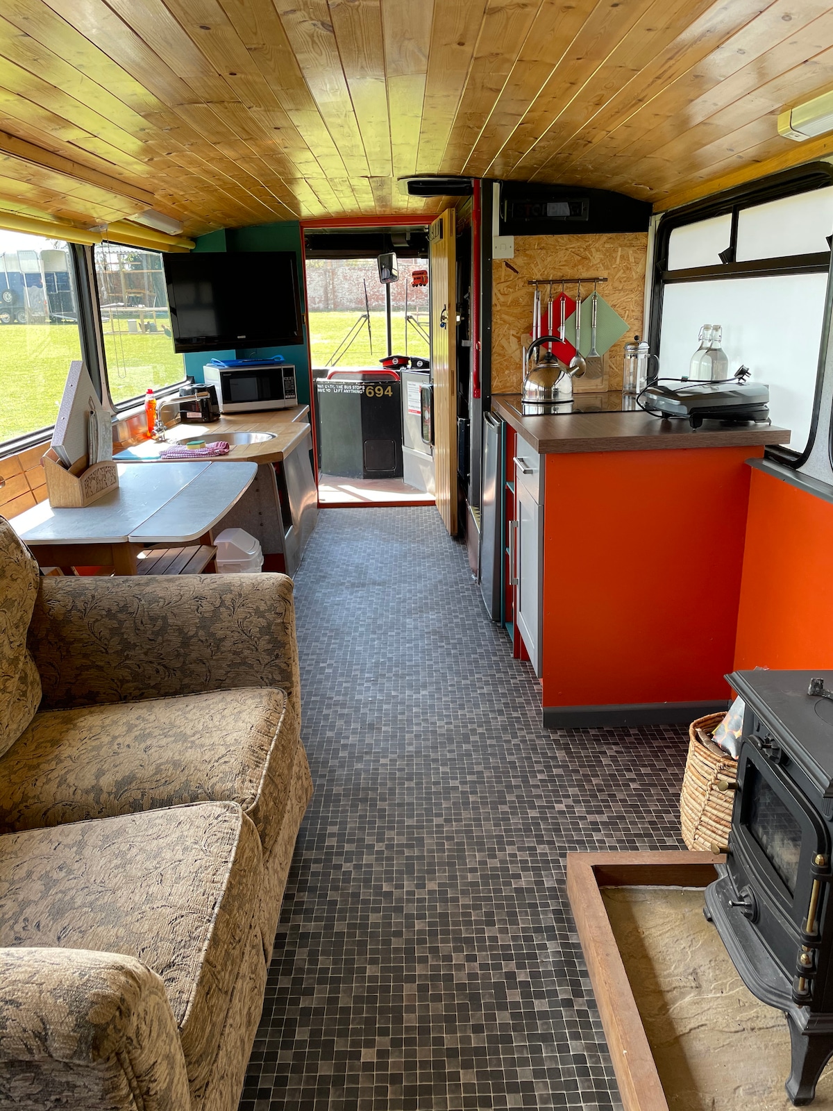 Walter, a Denis Dominator Bus, is creatively designed and fitted with modern and upcycled materials, focusing on warmth and comfort. Walter accommodates four people in a double room, a small double sofa bed, and a single sofa bed. We can provide a cot. Ideal for two adults and 2 or 3 children. Walter is situated in her field surrounded by trees, with a sunken wildflower garden, Bar B Que, patio and heaps of outside space where wildlife thrives and the steam train occasionally passes.