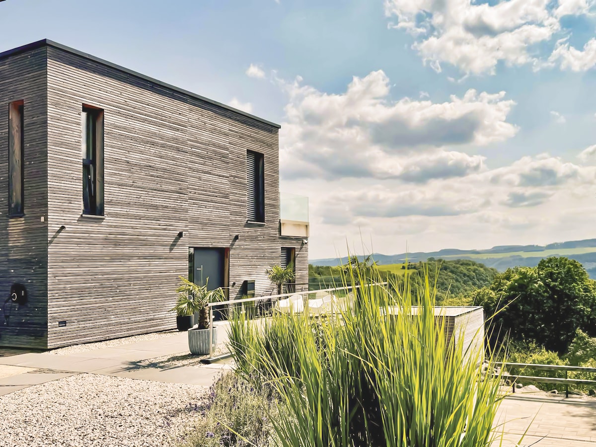 LuxApart Loft (No3) – your stylish retreat with outdoor sauna – ideal for couples and small families. Enjoy 110 sqm of comfort with breathtaking views of the Eifel forests and the Ahr Valley. Featuring an open-plan kitchen with dining area, a cozy living room, separate bedroom, and a spacious 50 sqm south-facing terrace with private outdoor panoramic sauna. Unwind and enjoy peaceful days – surrounded by nature, with design, views, and a relaxing atmosphere.