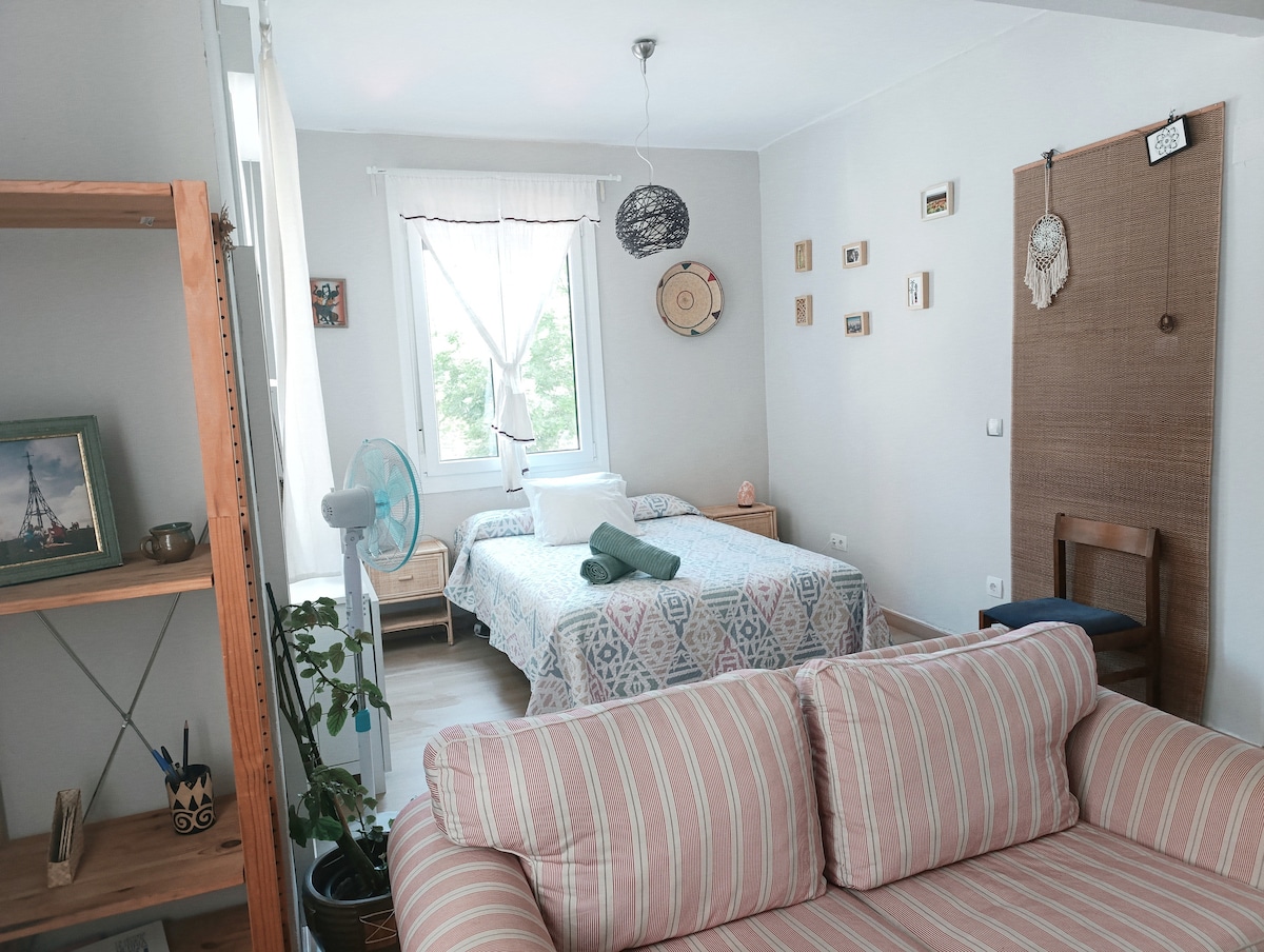 Studio 33m2 on the basement floor of a large house. Entrance through a large bay window. A 140x200cm double bed in the bedroom adjoining the dining/living area, which also has a single bed. Kitchenette with all utensils for preparing meals. The bathroom has a 160x200cm shower. Bed linen and towels provided. On the garden side, a wooden terrace with a dining area and a barbecue. Deckchairs for relaxation. Outdoor shower.