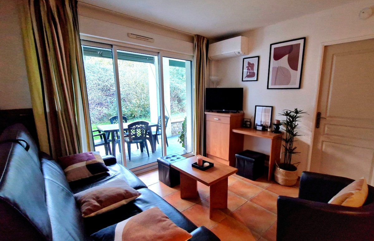 Appartement de 34m² au rez-de-chaussée d'une résidence calme de Ciboure avec Piscine, à 20 min à pied de la Grande plage de Saint-Jean-de-Luz. Entièrement rénové, équipé et décoré avec goût. Il dispose d'une place de parking privative, d'une terrasse couverte avec mobilier extérieur avec vue sur la piscine de la résidence. Fonctionnel et confortable pour 4 voyageurs. Entre farniente, visites et activités sportives (surf, balades, randos), tout est réuni pour un séjour exceptionnel.