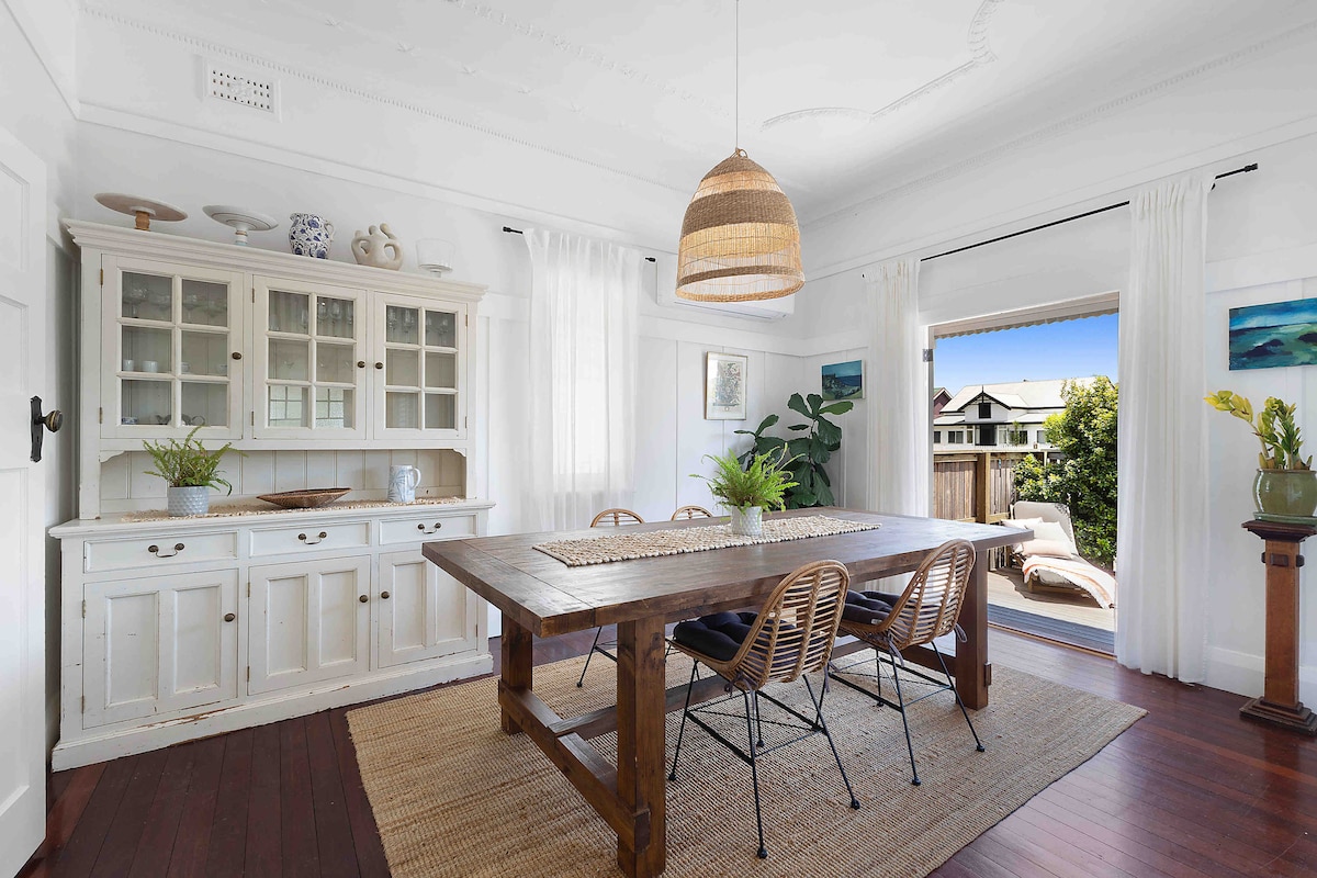 This family holiday home is ideal for anyone looking for a relaxing quiet holiday by the beach. It is light, open and airy, with a garden and front deck. It is not even close to 5 star luxury but an old timber house that we have made clean and functional . Our families have enjoyed the house over 5 generations .The kitchen is stocked but unrenovated. It has 4 bedrooms with 2 upstairs ,2 small ones downstairs. It is 5 minute walk to the beach and shops. There is no under cover parking. Free Wifi.