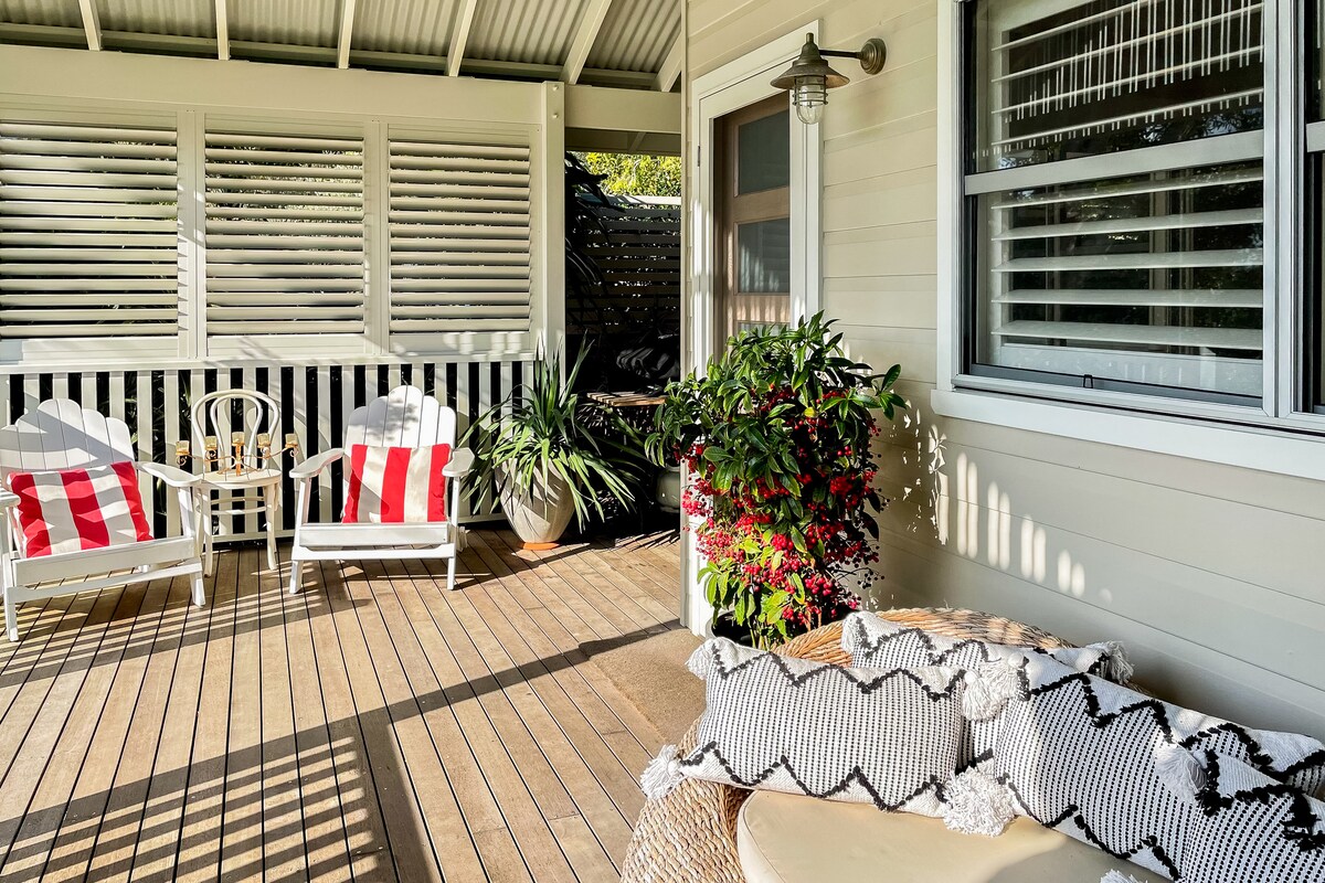 From the moment you step through the gate, you feel the relaxed Byron vibe! It's a 2 min walk to Baz & Shaz's 'pantry', 7 mins to Suffolk village, and 15 mins to Tallow Beach. The centre of bustling Byron is a 10 min drive. The Suite has a king-sized dbl bed, ensuite, private entry, private verandah and courtyard with table and chairs, and a desk in a nook. There's a kitchen cupboard with a microwave, bar fridge, toaster, kettle and crockery suitable for breakfasts and managing takeaway.