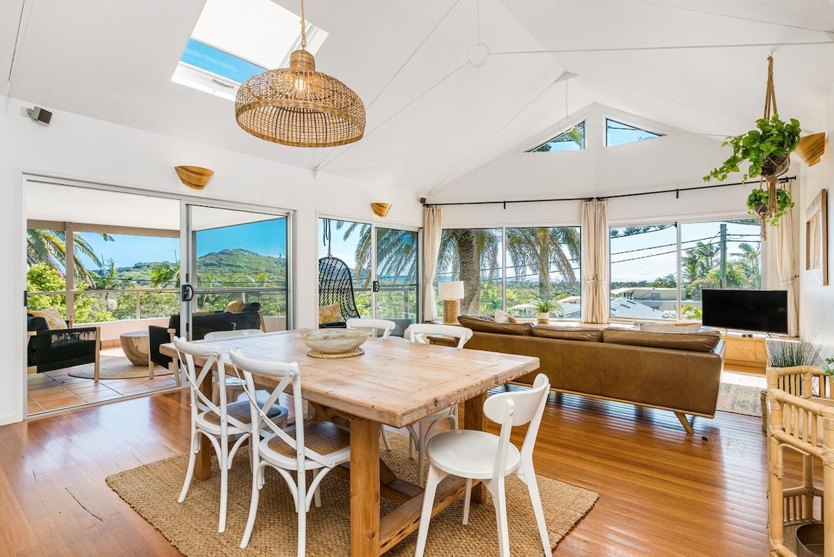 Set up high in the nature reserve that surrounds the powder-soft white sands and turquoise waters of Wategos Beach, Panorama is the place to stay whether you seek a relaxing beach holiday, fun-filled adventure, or simply want a slice of exotic paradise. The main living and sleeping areas are spread across one-level. The spacious living, dining and kitchen area opens to a generous outdoor living and entertaining space. The north facing deck is the perfect place to have a barbeque and sit back with loved ones to watch the sun set across the ocean. There are two bedrooms and a main bathroom, the bed configuration is as follows: Master Bedroom: Queen-size bed Bedroom two: King-single x 2 Approximately 200 metres from Watego's Beach, this property is located in the dress circle at Watego's and is about a 5 minute drive from the centre of Byron Bay. This holiday home is well-equipped and makes the perfect home-from-home for your stay with us in Byron Bay.