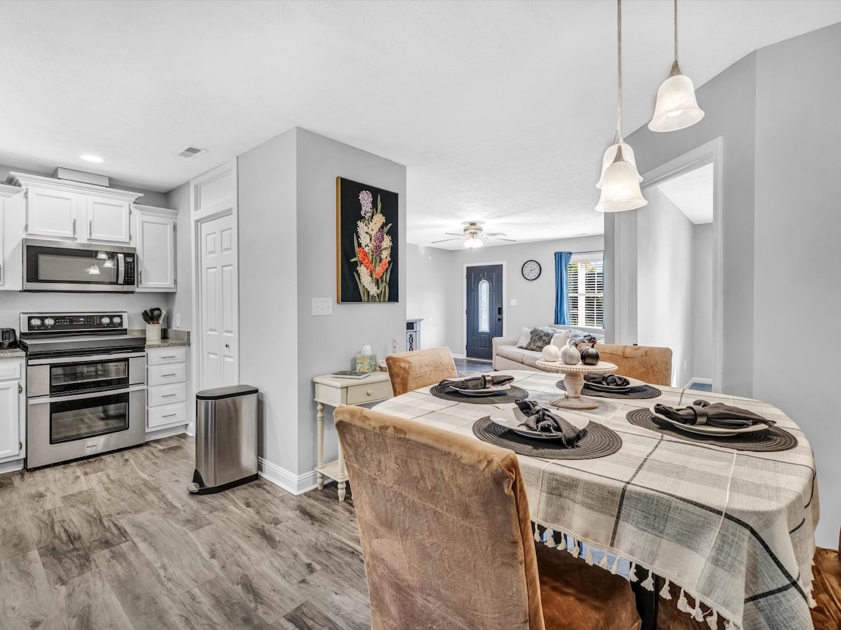 Enjoy your stay at The Heart of Main! Our newly renovated house with modern upgrades, 4 bedrooms and 3 full bathrooms. -3 Queen & 2 King comfortable beds sleeping 10 adults -Wifi throughout the house -Outdoor porch seating -Electric Fireplace -Stocked kitchen -55" Smart TV in living room & 43" Smart TVs in rooms - Street parking and private parking -Within walking distance of excellent local eateries -Along N Main St walking trail -5 Min from Downtown/Ford Center -10 Min from Haynies Corner