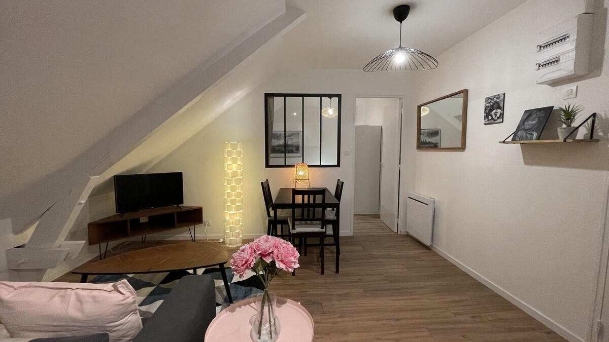 Profitez d'un logement 2 pièces élégant et central, refait à neuf avec isolation, situé à 2 min à pied de la Gare, 8 min du centre historique, parking gratuit. Wifi fibre espace bureau Tv. Cuisine équipée avec tout le nécessaire, lave linge, lave vaisselle. Non fumeur. Situé au 2eme etage au calme un bel immeuble avec digicode. Accès self check in. Bagage peuvent être mis à la cave en cas d'arrivée avant l'heure prévue.