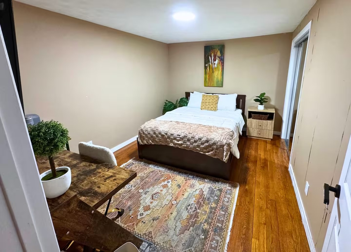 温馨私人标准双人床卧室|书桌、电视|靠近波士顿