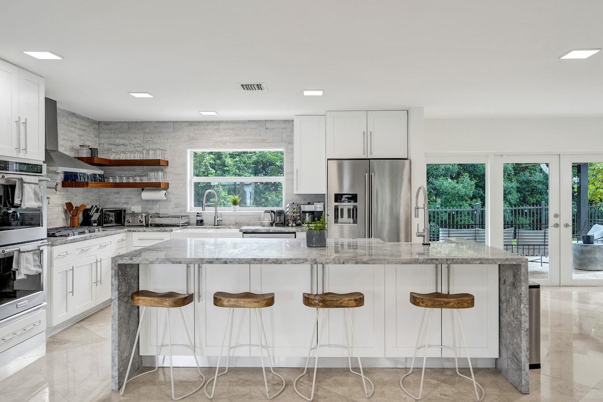 Come and create unforgettable memories in this modernly designed single-family home with a spacious layout and a range of comfortable bedrooms. It features two king-size beds, one queen-size bed, and a twin fold-up bed, as well as an Italian queen-size sofa bed. The house is bathed in natural light and boasts modern amenities that cater to your convenience. Located in a prime location, this house is close to all the tourist areas!! The pool is salt water with heater, Also a grill area