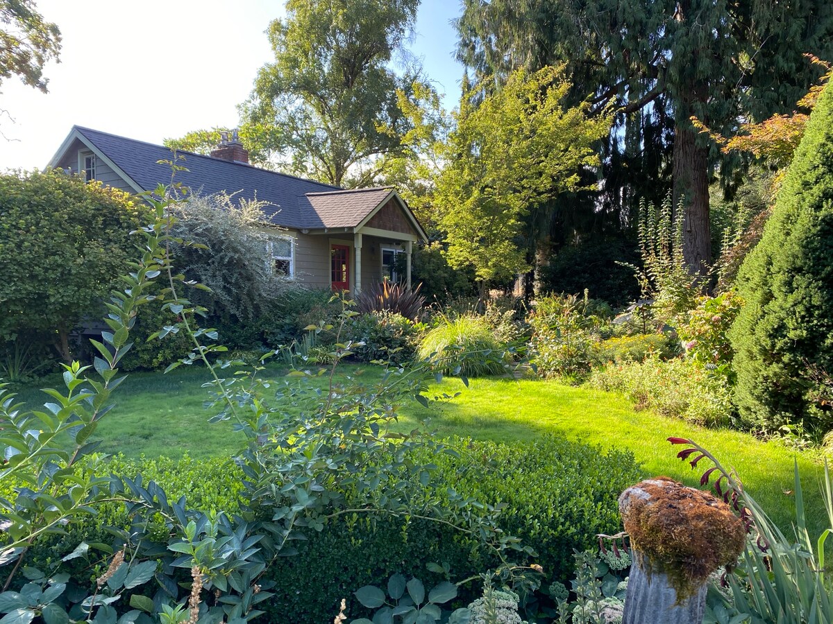 Nestled beneath a majestic mature Redwood, this private mid-century cottage is your ideal Oregon wine country escape. Enjoy a private entrance, cozy kitchenette, curated art, live plants & natural light that pours in all day. Step outside to your exclusive deck and firepit — perfect for evening wine pours under the stars. A peaceful retreat with mid-century charm, yet just a 20-minute stroll to McMinnville's Historic 3rd Street dining, boutiques & wine tasting rooms. Dog-friendly. Self check-in.