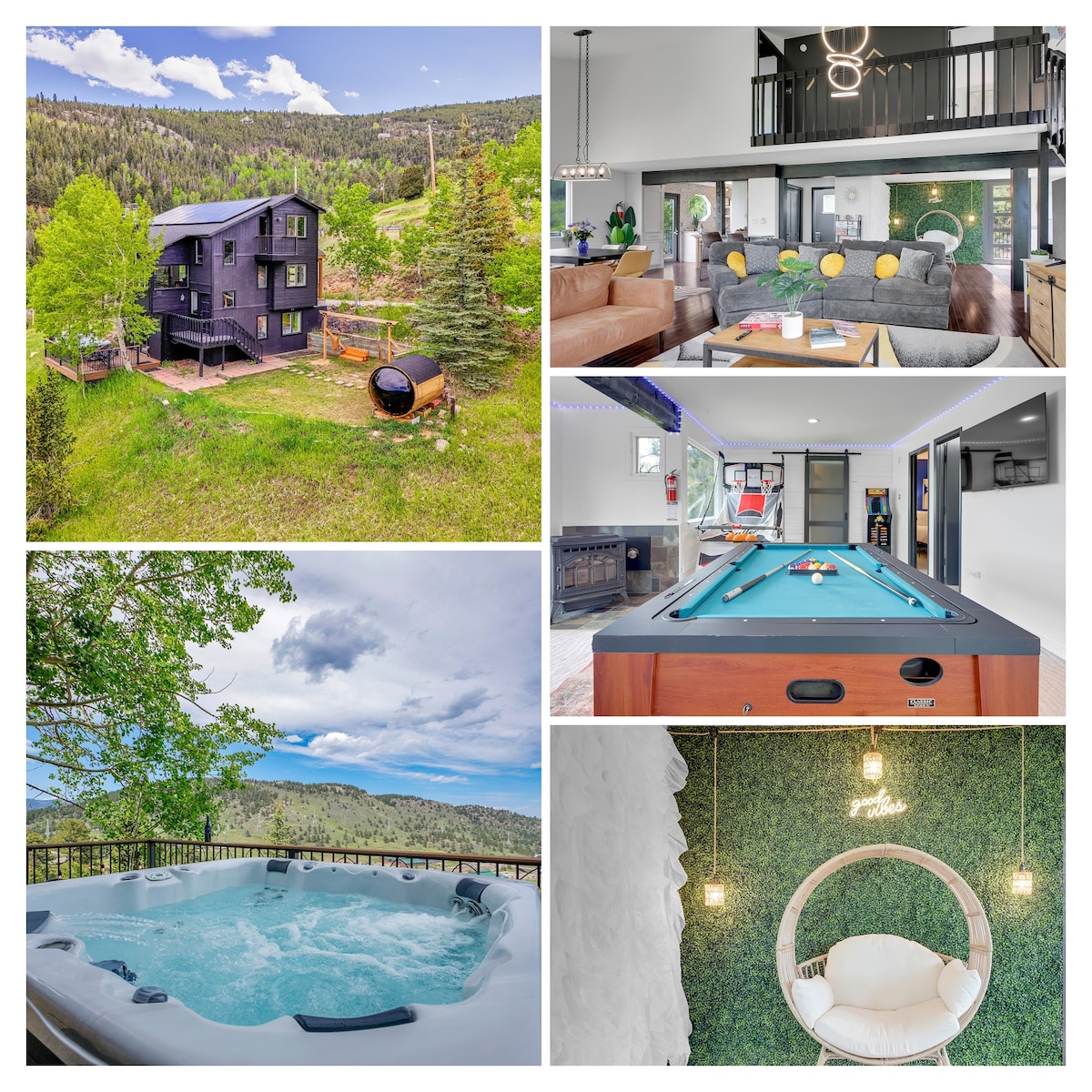 4.95 stars, 175+ stays+, Airbnb’s top 5% of homes. Spacious 3-story, 3,027 sq ft home at 8,500 ft elevation on 2 private acres of Aspen & Pine—with sweeping mountain + Denver city views. Relax in the hot tub on a brand-new deck, enjoy billiards, ping pong, and multiple fireplaces, or unwind in one of 4 private bedrooms—3 with luxury king beds. Family-friendly, peaceful, and wildlife-rich. 📍30–60 mins to ski resorts + Denver 🛒 15 mins to groceries/restaurants 🚘 Easy I-70 access