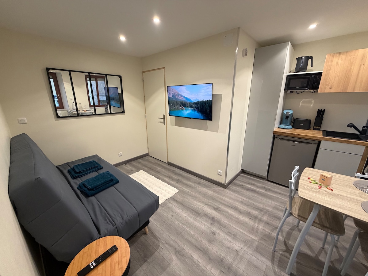Beautiful fully equipped studio with terrace in a small, very quiet residence, ideally located for holidays or several days of work (near GE Alstom), close to shops, and free parking at the bottom of the building. Completely renovated and decorated with care (summer or winter style), you will not miss anything and will be immediately in a good vibes. Located on the cycle path connecting with Belfort, you can reach the city in few minutes or enjoy the nature on Ballon d'Alsace snowy mountain