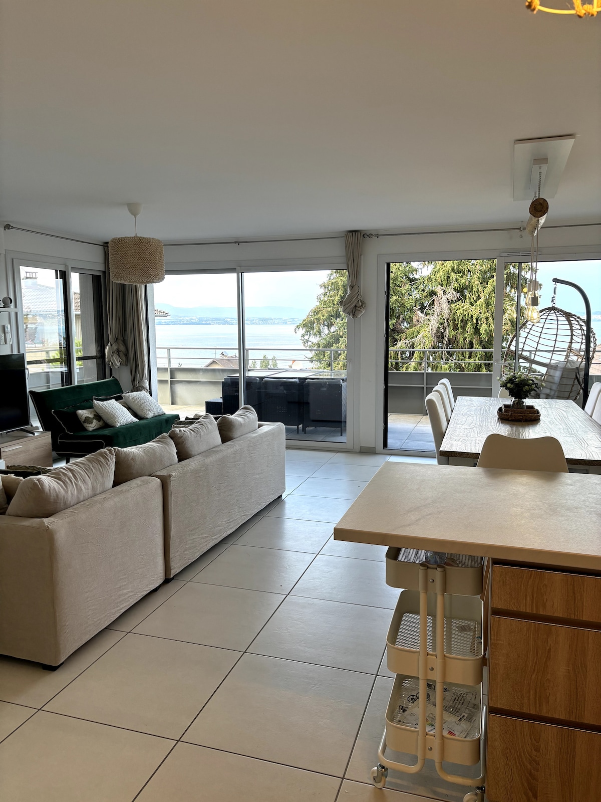 Appartement au rdc d'une maison avec vue panoramique du lac Léman. Idéal familles, à proximité immédiate des vignes et chemin ms de randonnées. A 20' des stations de Thollon les Mémises et Bernex, à 50' d’Avoriaz et de Châtel. Vous recherchez de la tranquillité, un environnement bucolique à 5 min d'Evian et de Thonon , alors notre logement est fait pour vous ! Profitez d'une belle pièce de vie lumineuse et terrasse avec vue sur le lac. Linge de maison et serviettes de toilettes fournis.