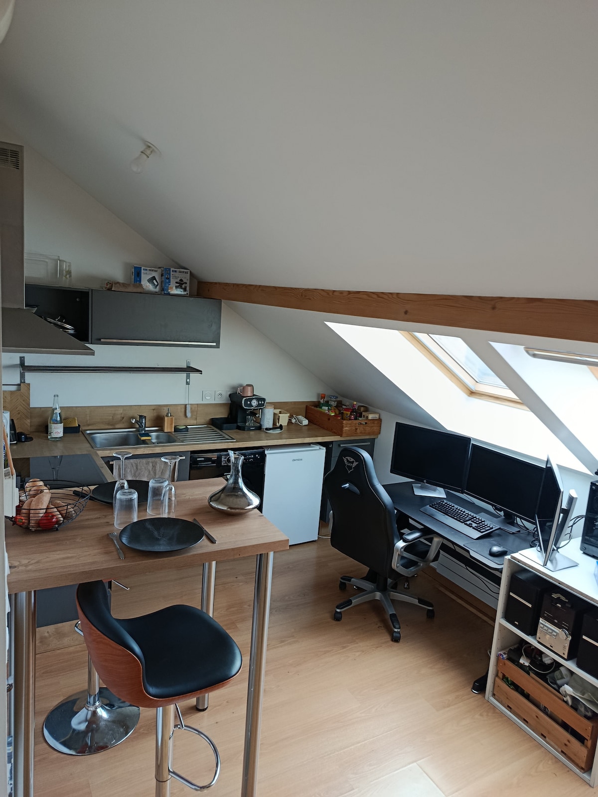Your loft in Vevey is located in the pedestrian zone directly on the Quai. A large comfortable bed (200x210cm) can be split on request. Cot(s) if required. Well-stocked library for rainy days. The highlight is the terrace with a magnificent view. The table in front of the loft is reserved for you. The shower/WC is small but functional. Kitchen with large gas cooker, oven, dishwasher and cool crockery. Natural materials and beautiful furniture.