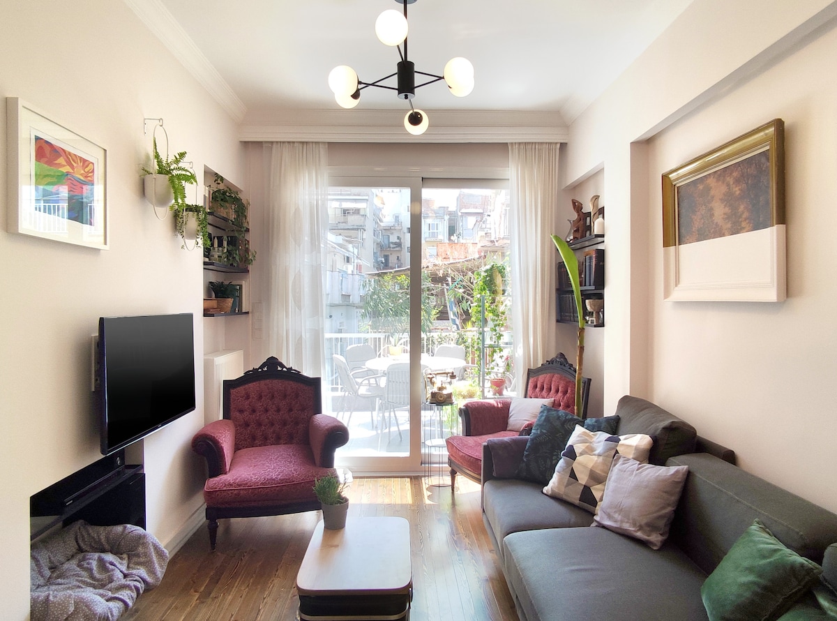 Unique 1 Bedroom fully equipped apartment on the seventh floor of a 2020 renovated building with a breathtaking terrace balcony. High speed internet, premium amenities, a luxurious queen size bed, and your very own Netflix account are but a few things we offer you. Luminous, spacious, with everything you might require to enjoy your stay in the heart of Thessaloniki's social life, only 5 minutes away from Aristotelous square and 2 minutes from the seafront. Welcome and enjoy your stay!