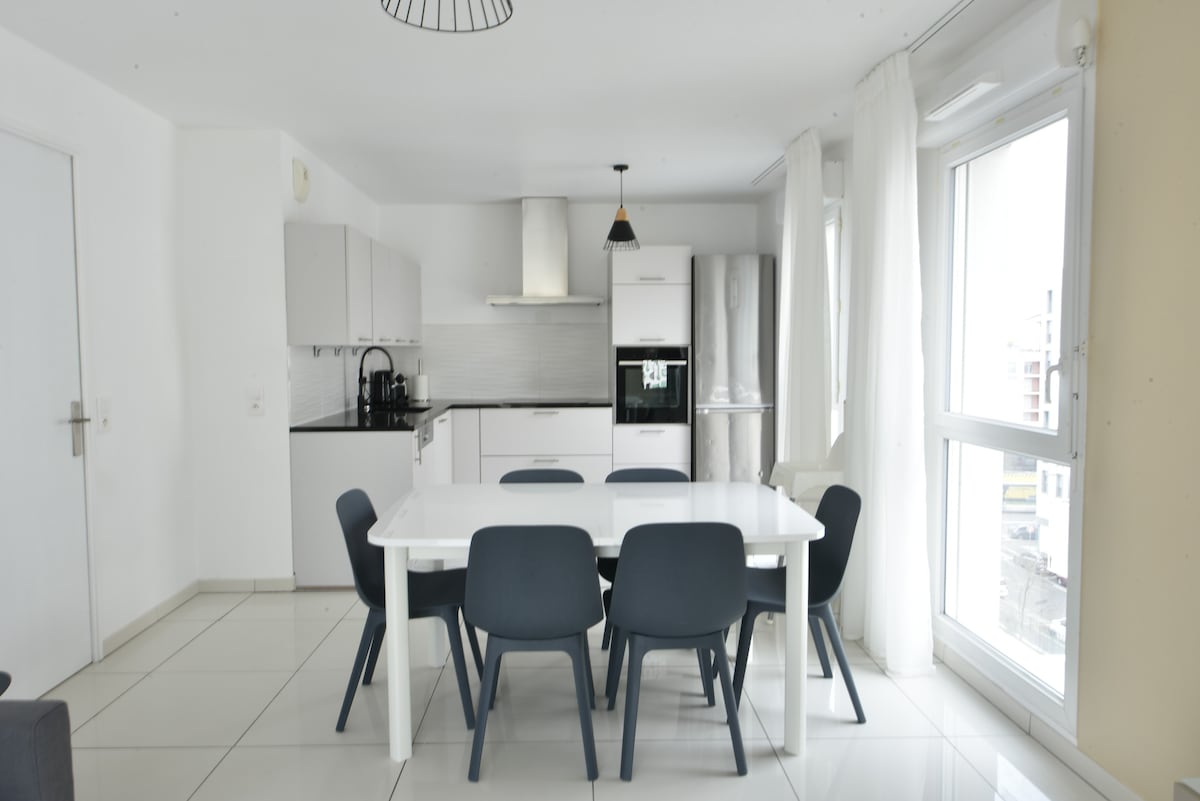 Studio de 32m2, parfait pour accueillir jusqu'à 2 personnes. Situé Résidence calme, à 5 minutes à pied de la gare, du C.Commercial Le SPOT et du tramway. À propos: ✦Arrivée autonome à partir de 16h00 grâce à notre serrure connectée. ✦Canapé-lit confortable 160x200 cm, pour se détendre. ✦Cuisine tout équipée machine à laver pour vos besoins. ✦Connexion Wi-Fi gratuite accès internet illimité. ✦Espace dressing comme chez vous. ✦Café et thé offerts : à votre arrivée, offerte par la maison.
