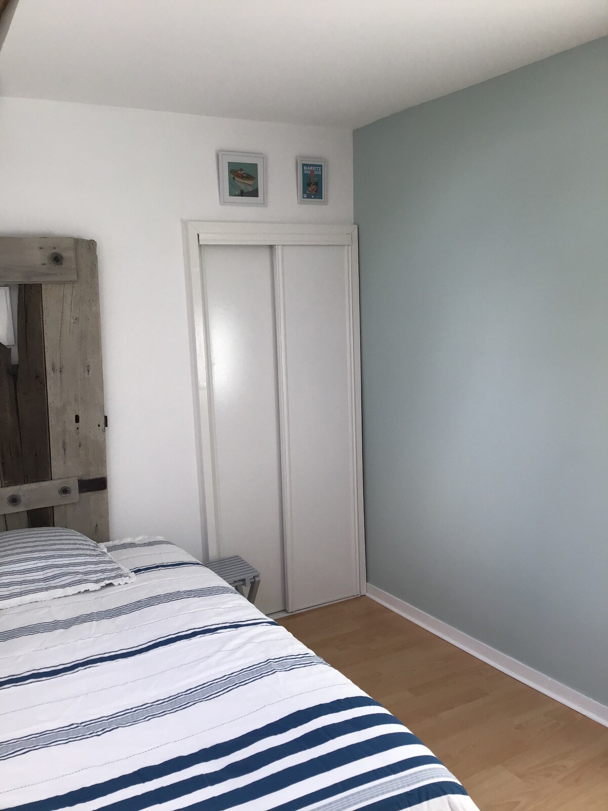 L'appartement est divisé en 2 hébergements fermant chacun avec sa clé L'entrée de l'appartement est commune aux 2 hébergements. L'hébergement des voyageurs avec vue sur la Tour Eiffel n'est pas partagé, c'est comme un studio avec balcon. Il y a un espace chambre avec un lit Queen size, 1 armoire-penderie, lampadaires, cuisine équipée et petit espace douche. Le WC est en face la chambre. Au balcon : 1 table et 2 chaises, un espace est réservé au jardinage.