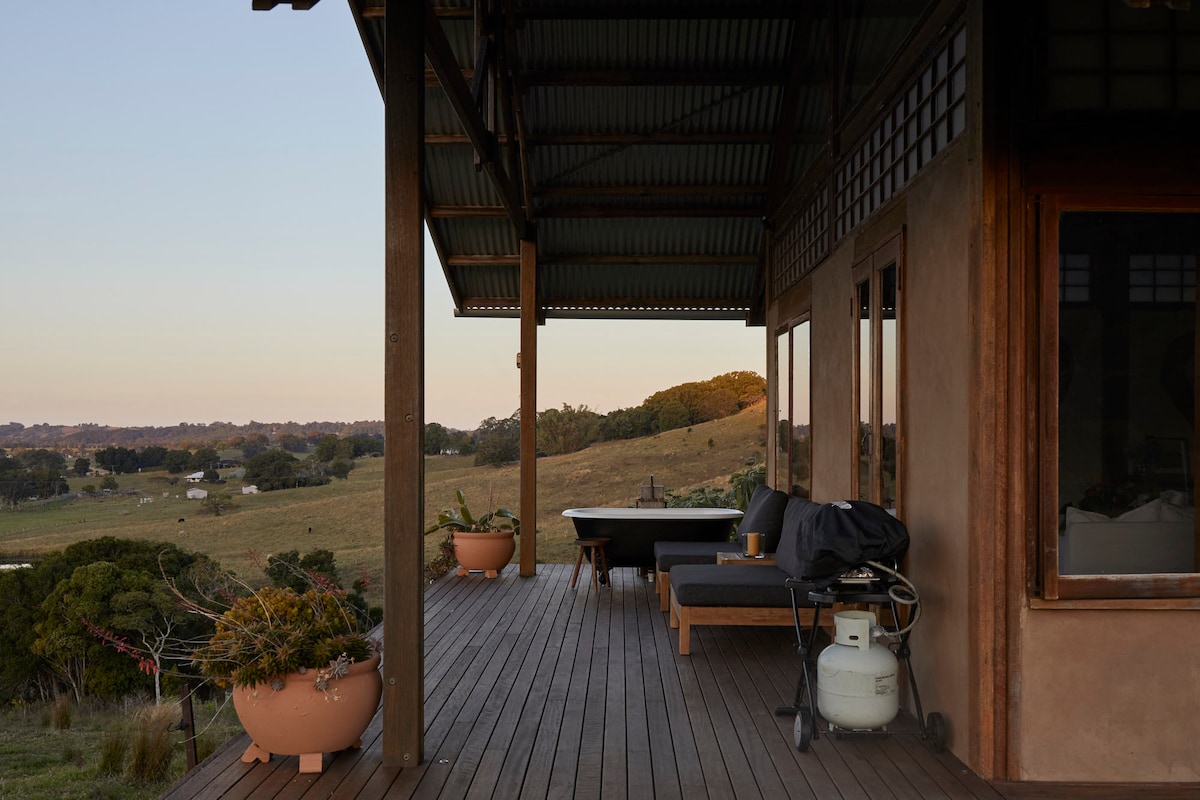 Relax on the deck and enjoy sunrise to sunset views, and watch the cows traverse the pasture. A self-contained villa amidst a working cattle farm, with distant country views - you will feel immersed in countryside. Rustic farmhouse style with a unique Japanese aesthetic, our sustainable eco villa is a quiet healthy haven with natural lime-rendered hempcrete walls, recycled timber features. The lower floor is spacious living-dining-kitchen-study and bathroom. On the upper loft is QS bedroom.