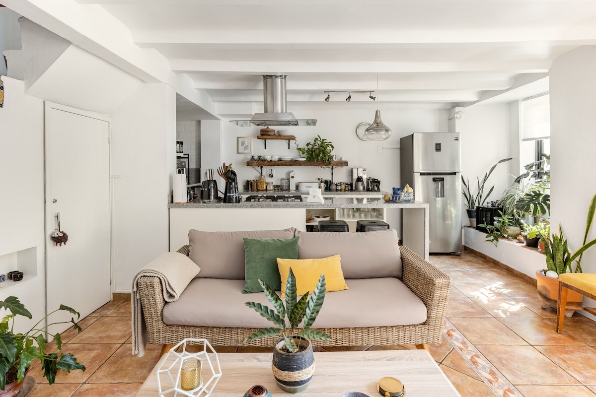 This gorgeous home features a bright and open interior with colorful furnishings and stylish accents. Notice the Mexican tiles in the kitchen. Admire the expressive artwork, and lounge on the vibrant blue sofa in the living area. The home's central location provides access to many of Puebla's historic sites. Walk to the iconic Puente de Bubas, roam the Biblioteca Palafoxiana, and explore the museums all while stopping to experience the fantastic local foods and drinks.