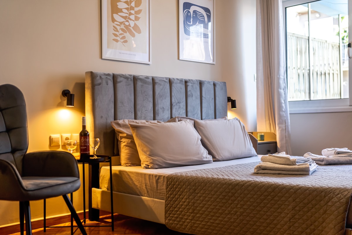 Enjoy a stylish experience in one of Athens' most lively neighbourhoods. Our fully renovated one (1) bedroom flat is located on 4th floor of a residential establishment offering a homey atmosphere, view of the Acropolis from the patio and easy access to the city's most famous attractions. The sunny flat has all necessary amenities for longer stays with the special mattress being the highlight for a comfy sleep.