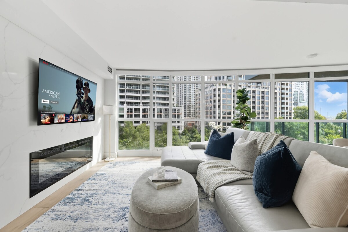 Spacious 1 bed+den modern condo located in the heart of downtown. Steps from the lake, parks, recreation centers. Short walk to CN Tower, Union Station, Rogers Center, Convention Center. → FAST WIFI Perfect for WFH, video calls, & streaming → Approx size 620ft² / 57m² → Dedicated Working space → 60" QLED TV → *NEW 2024* Fully equipped kitchen w/ set of cookware → Walking distance to dining & night life option → Minutes away from grocery, liquor stores, & city transit network (94 Transit Score)