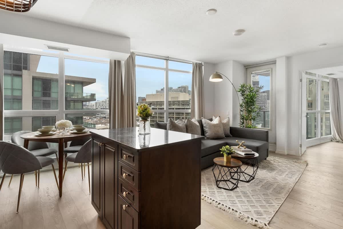 Enjoy a trendy and cozy experience at this centrally located condo. This 1 bedroom, 1 bathroom unit is located in the heart of the city within walking distance to many of Toronto's most popular restaurants, bars and tourist destinations. Steps away from King street, The Well and walking distance from the CN Tower, Rogers Centre, Ripley' s Aquarium and much more. The unit is equipped with high speed Wi-Fi with unlimited internet. You can also enjoy the gym and studio room.