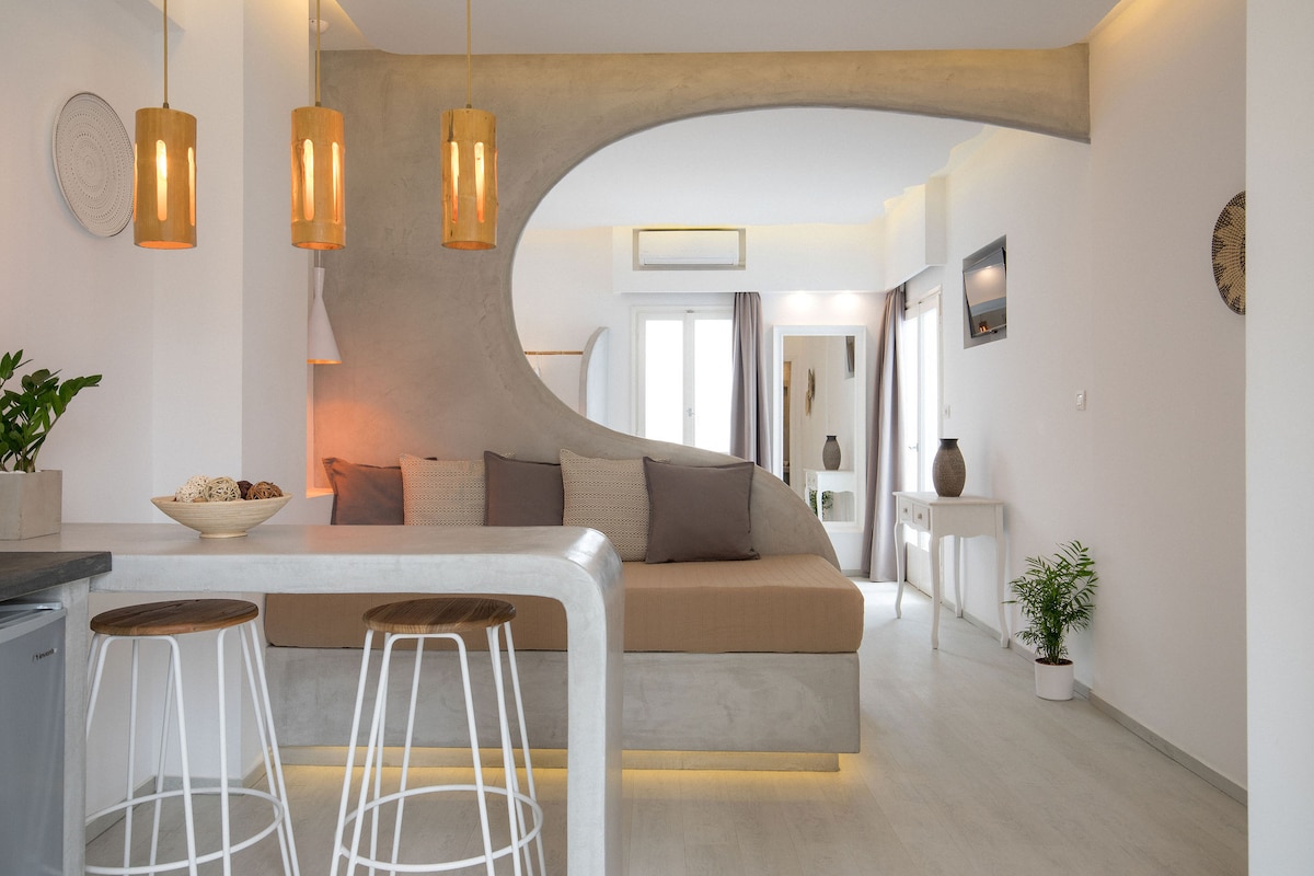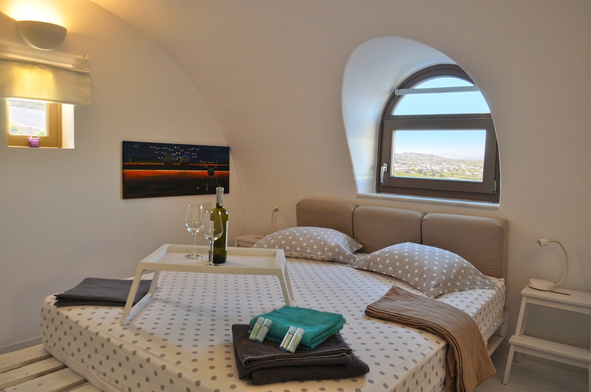 Anemos suite is located in Akrotiri overlooking the caldera and the volcanic islands . It is a suite with Private, Infinity heated Cave style plunge pool with Jet system and private patio. There is a king size bed that can accommodate two person. Daily breakfast is included and served in your suite . There is a cleaning service included. Inform us about your arrival details in advance , we can arrange a taxi/transfer for you.