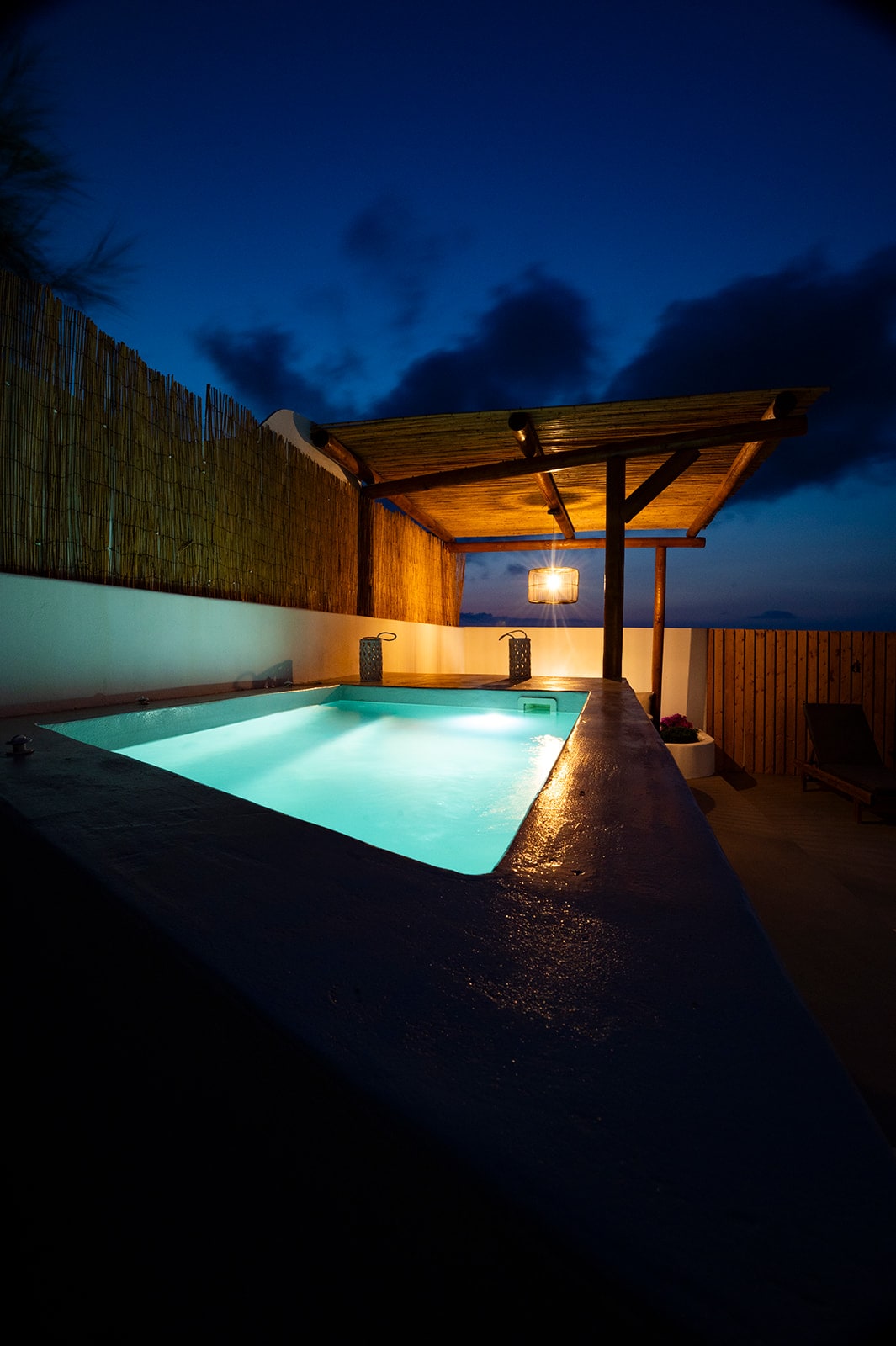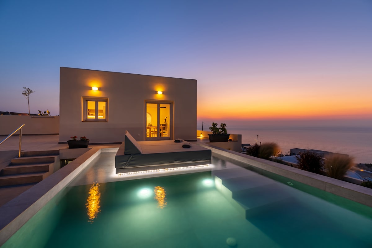 Ambeli Sunset Villa's unique allocation provides the famous sunset view of the caldera avoiding the overcrowding of the well-known cities of Santorini. A newly anti-seismic constructed building covering all the official guidelines to maximize the security of our guests. Depending on the chosen room type that fits you, guests will experience the use of the heated pool or the hot tub in maximum privacy as no facilities are public.