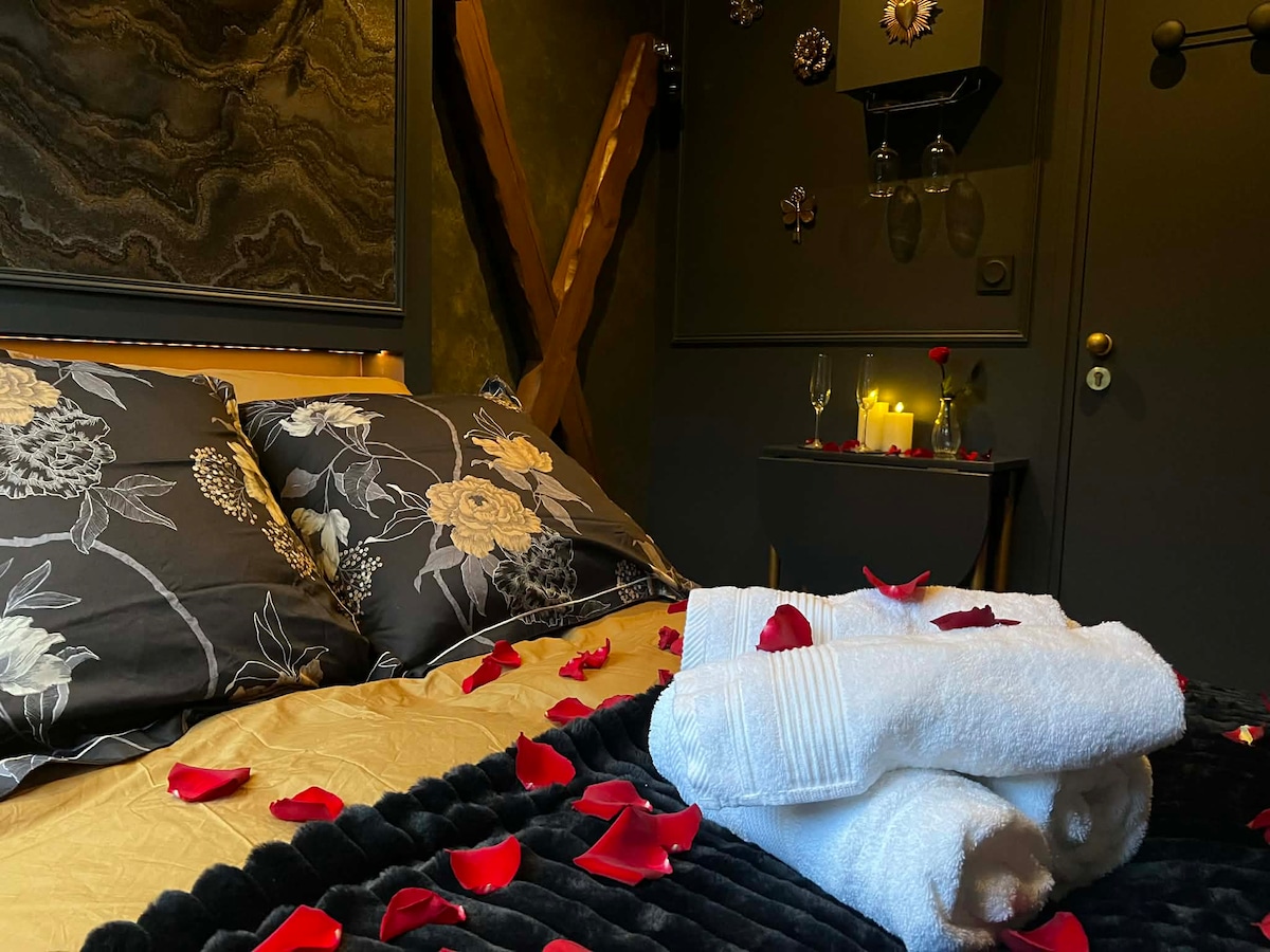 Cette love room au style chic et baroque offre un cocon romantique. Un lieu idéal pour assouvir vos fantasmes. Profitez de tous les accessoires à disposition pour vous amuser et passer un bon moment coquin Des options vous sont proposées pour un séjour personnalisé (SPA, repas et accessoires) Possibilité de louer en journée