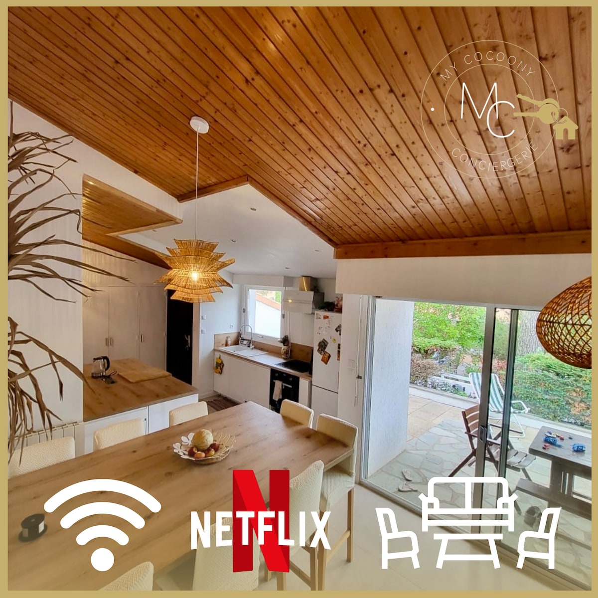 Logement classé de Tourisme Nous vous proposons une maison pleine de charme fraîchement rénovée en 2019 pour vos vacances et weekends. Elle est faite pour un séjour en famille ou entre amis. Votre animal de compagnie est aussi le bienvenu car le terrain est entièrement clos. Elle est idéalement située face à la forêt, à 300 mètres de la plage et 150 mètres des commerces. Notre Dame de Monts est à 15 km de l'île de Noirmoutier, 15 km embarcadère pour l’île d'Yeu, 30 de St Gilles Croix de Vie