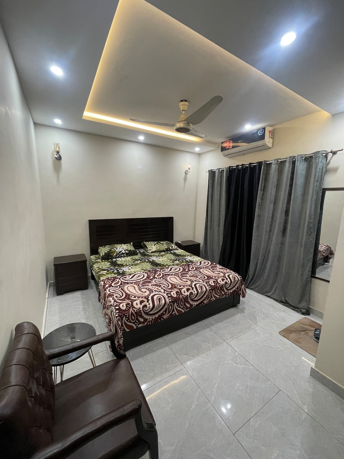 Enjoy a cozy retreat in this modern, well-lit bedroom featuring stylish décor, soft side lighting, and elegant furniture. The warm ambiance creates the perfect setting to relax, while thoughtful details like seating space, artwork, and premium finishes add comfort. Located in Lahore’s prime area, this space is ideal for short or long stays, whether you’re traveling for work, leisure, or a weekend getaway. -This photo is digitally staged to show lighting ambiance — actual setup may vary slightly