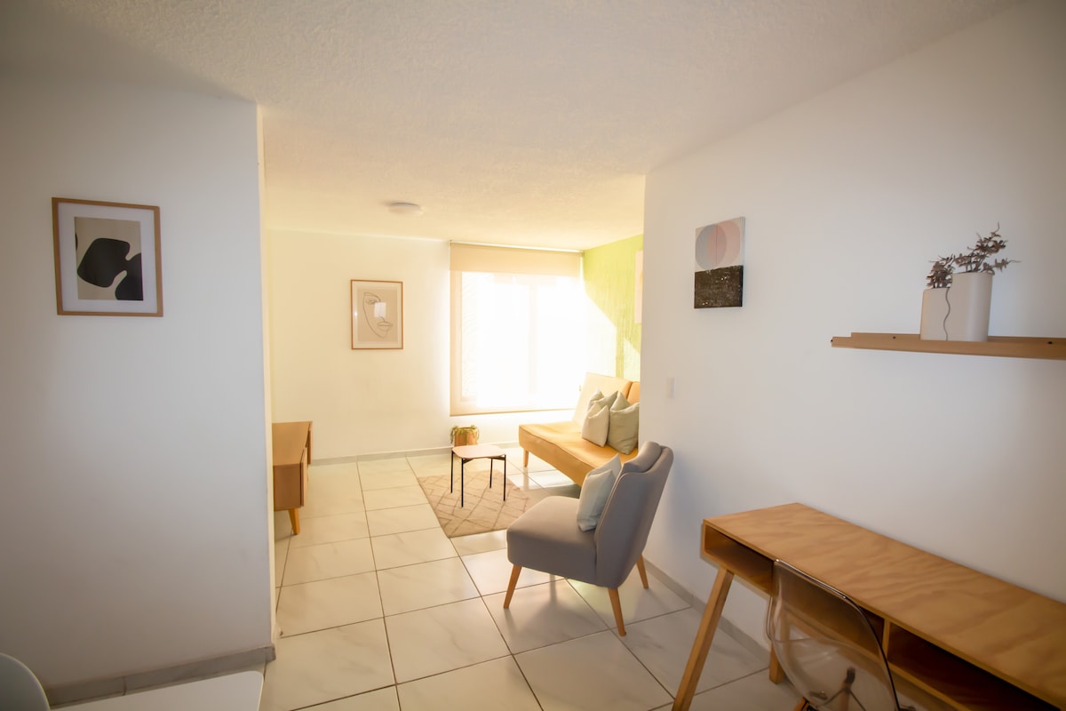 Super departamento a tres cuadras de Expo Guadalajara! Equipado, amplío (160 m) é inteligente, limpio y de buen gusto. Cómodas camas y cortinas blackout en las habitaciones para un descanso reconfortante y continuo. Cocina grande con barra desayunadora, equipada con Cafetera Nespresso (trae tus cápsulas), Cafetera, tostador, microondas, licuadora y todo lo necesario para sentirte en casa. Estacionamiento propio a la puerta. Excelente ubicación, a 5 min de Plaza del Sol y acceso a vias rápidas.