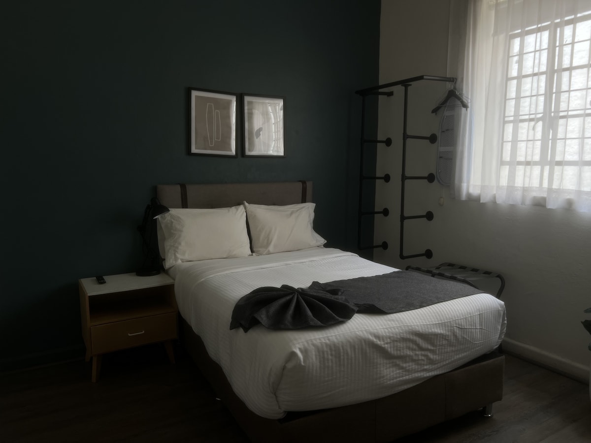 Habitación cómoda con terraza y baño privados dentro del Hostal Nube Mia. Este es un hostal céntrico, recién remodelado frente al parque Rojo en el corazón de Guadalajara. El hostal fue diseñado para que nuestros huéspedes disfruten de estar o trabajar en su espacio; brindamos servicio de limpieza diario. Los huéspedes tienen acceso a una hermosa terraza con vista a la ciudad, y a una sala de estar con tv, comedor y cocina equipada de uso común.