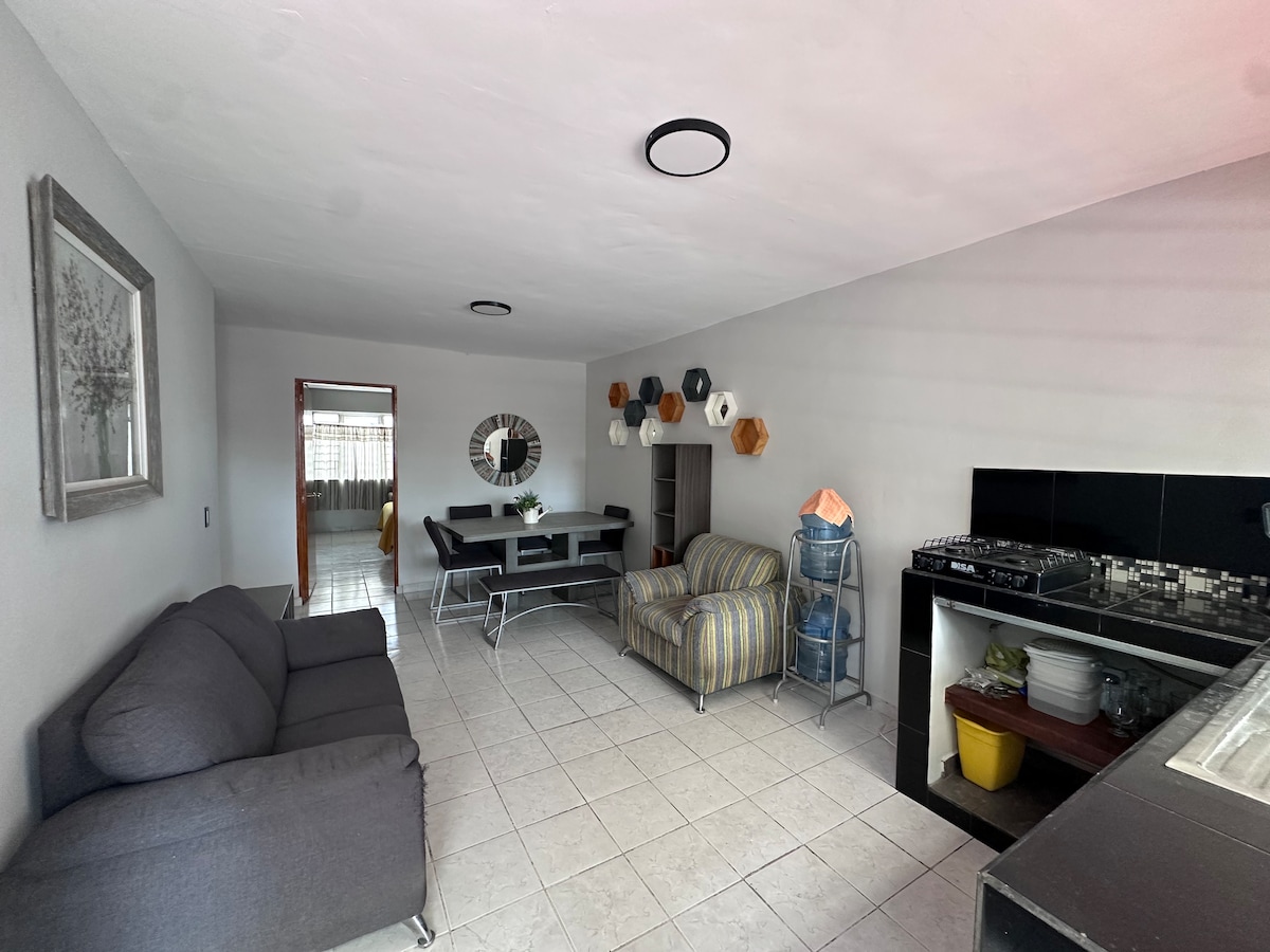 Disfruta de la sencillez de este alojamiento en la Planta Baja, tranquilo y céntrico, es como estar en tu propio hogar, con la ventaja que, alrededor encuentras todo lo indispensable para tu estancia, como tiendas, carnicerías, supermercado, plazas Comerciales como plaza del Sol y La Perla. A 10 min. en vehículo a la Expo Guadalajara y centro joyero, a 30 min. en vehículo al centro histórico y a 30 min. del aeropuerto Internacional de Guadalajara.