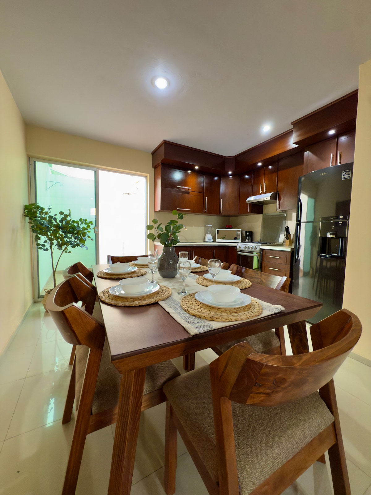 Amplia casa de una planta, con agradable patio y zona de estar con mesa y asador de carbón. Dos habitaciones con cama matrimonial y una con matrimonial e individual (colchón extra disponible). Cuentan con clóset, escritorio, smart TV. Wifi 100+ mb . Cocina equipada, cafetera, licuadora, refri, horno tostador y micro. A 1 km de Plaza del Sol, 2.5 km de Expo Guadalajara y en la cercanía de múltiples restaurantes, bares, parques y supermercados.