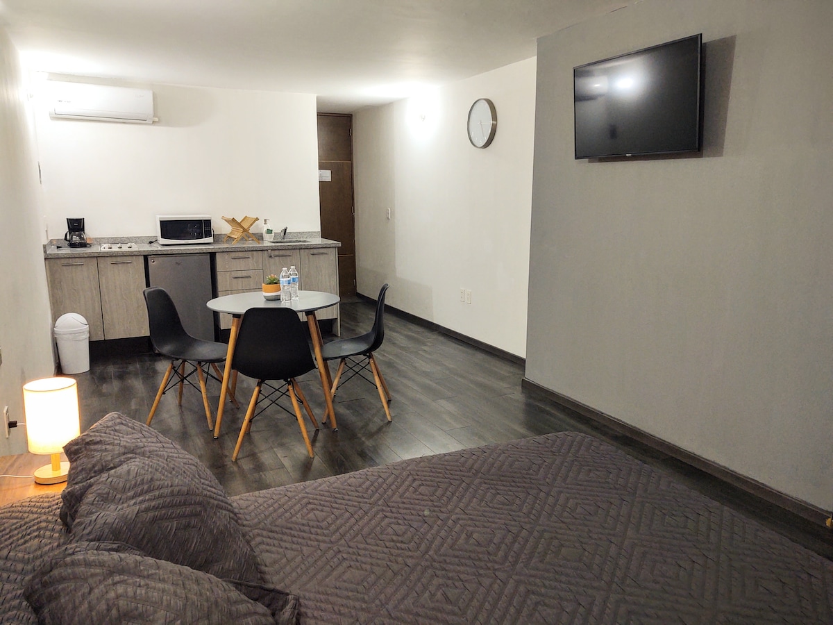We’re BACK! We’ve given this apartment a refresh and some love, and now it’s ready and waiting for you! Stay in one of Guadalajara’s most popular areas and enjoy all the amenities including a new queen size bed, kitchenette, high speed internet, and full bathroom. We’re on a quiet street but just a couple blocks away from great cafes, restaurants, convenience stores, and an old-school gym with an open-air pool (they do day passes!). Stay here!
