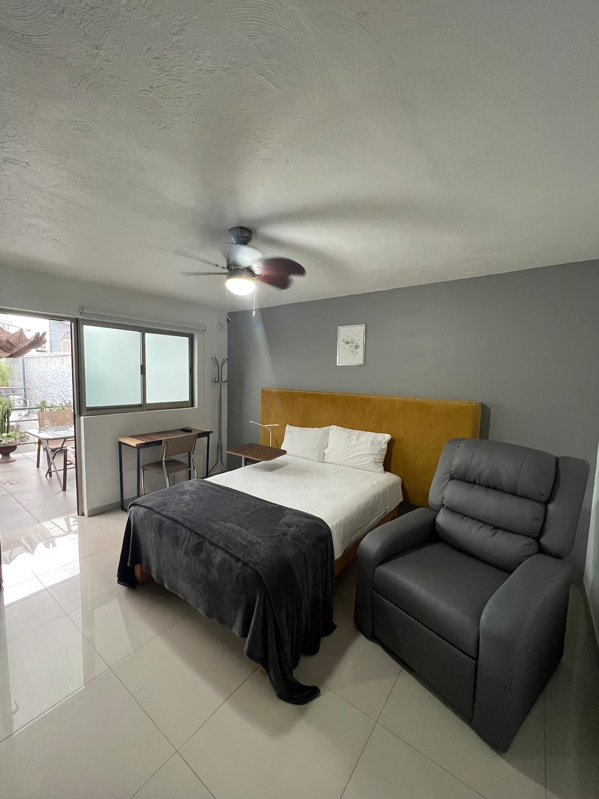 Los 3 pisos de escalera lo valen para que disfrutes los bellos atardeceres de Guadalajara en una de las colonias más seguras, mejor conectadas y de mayor oferta gastronómica de la ciudad. Este moderno estudio pet friendly, está acondicionado para estadías cortas o largas. Cuenta con una extraordinaria terraza para recibir a tus visitas. Es un departamento entero con una cama queen, comedor, cocina integral, terraza privada, lavadora, plancha, televisión, internet (100 mb) y caja fuerte.