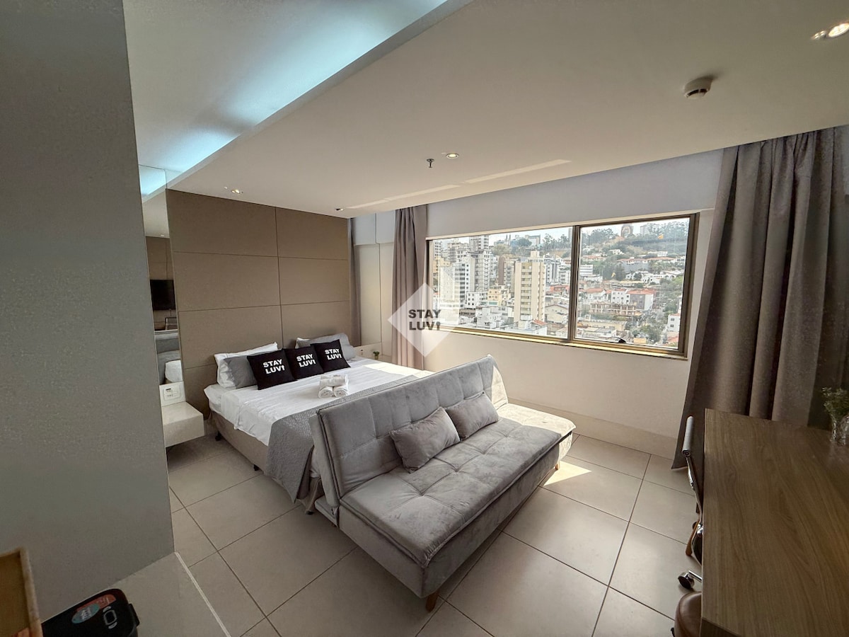 Loft luxuoso, 45 m2, ar condicionado, mesa para 4 pessoas e bancada, cozinha completa e equipada, máq. lava-seca, máq. Nespresso e outras praticidades. Muito espaçoso com cama queen, 1 sofa-cama e Smart TV 55'' c wifi e net. Linda vista! Área externa comum: Academia completa, lavanderia, piscina aquecida, jacuzzi e sauna. Loc. privilegiada próximo ao Diamond, Hosp. Materdei, Mercado Central de BH, Supernosso, etc. 1 vaga e Portaria 24 horas Comodidades q vc se sente em casa!