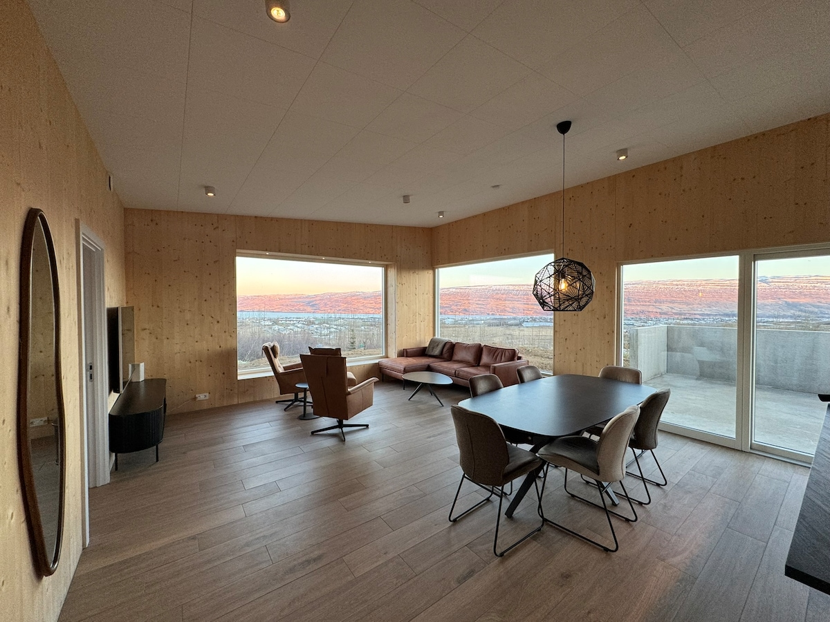 This modern and privately owned 106 m2 luxury cottage is located right above Akureyri and has gorgeous views over town and the surrounding nature. The house comes with a fully equipped kitchen, flatscreen TV and Wifi, entertainment system/board games and a cozy indoor hot tub to relax in after a long day.
