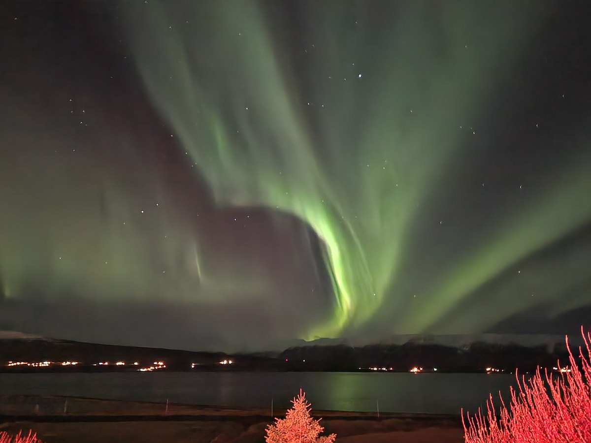 Take a break and unwind at our warm and peaceful cabin with mountain view. The northern lights may dance for you in the night sky. From the cabin you have a view in and out the fjord, to the sea and a glance at the lights of Akureyri. Enjoy nice walks surrounding in nature, forest, mountain. Non smoking property with free WiFi and private parking. 3 km drive to The Christmas house, 10 km to Akureyri city center and 24 km to Goðafoss waterfall. 1 hour drive to lake Mývatn, part of Diamond circle.