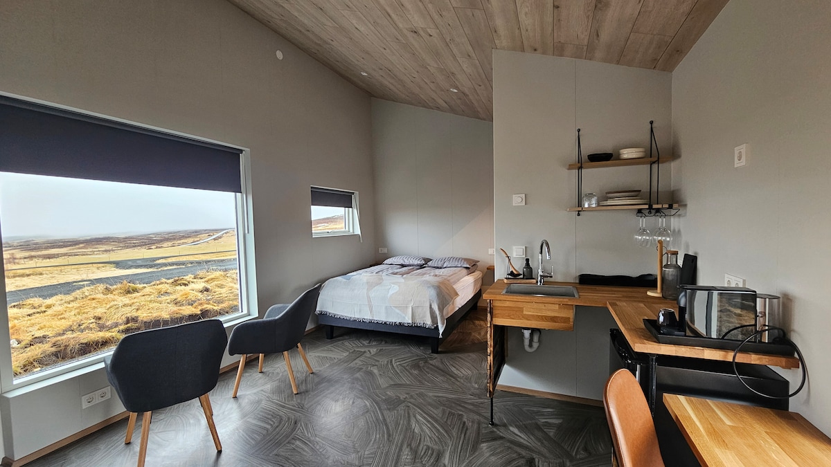A private cozy guesthouse on a farm in Skagafjordur, North west Iceland. The perfect getaway for a nature loving couple or friends. The cabin has everything you need to relax. We built the house in 2022. One bedroom with big double bed and another with small double bed , fully equipped kitchen facilities (stove, oven, pots, plates, utensils and coffee maker) with a fridge and a private bathroom with a shower. Outside we have platform with chairs so you can enjoy the weather.