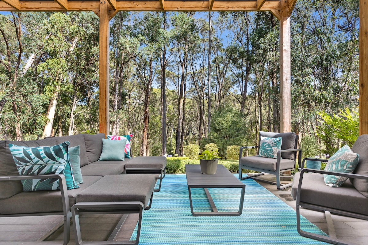 Stylish home with beautiful views looking out over the adjacent Wombat State Forest is just a short walk to the main street of Blackwood. You can enjoy breakfast or light lunch at the Post Office Café, perhaps a pub meal at the Blackwood Hotel, but for an amazing food experience, Blackwood Ridge is a must, but advanced bookings are advisable. There are many beautiful walks through the forest, and down by the Lerderderg River, and Garden of St Erth nursery, gardens and Café are also close by.