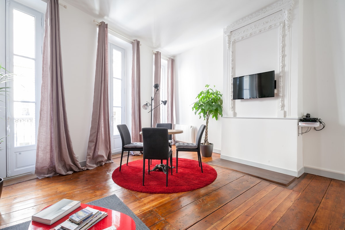 Charming flat typical of Bordeaux. This flat of 50 m2, located in Cours d'Albret, in a small bourgeois building is particularly comfortable, with an elegant decoration . Flat on a driving avenue for cars and buses. Windows are with double glazing. It is well equipped (wifi, Tv, queen size bed ....) and will allow you a comfortable stay. A few steps from the Palace of Justice, it is in the heart of the city center. Tram A and B , Bus G at : 50m. Supermarket, bakeries and restos nearby .