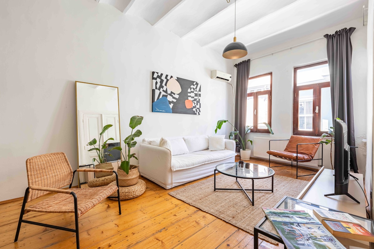 Our 1+1 flat is in the very old and central neighborhood of Beyoglu. The flat is in a secured residence building with 7/24h surveillance. In the flats' entrance there's an incorporated wardrobe. The american kitchen has all the essentials: refrigerator, oven, hot plate and also the necessities. In the living-room you will find a 4K TV in front of the sofa-bed (in which 1 persons can fit). There's also an air conditioning. Besides, our bedroom has a King size bed with an orthopedic mattress.