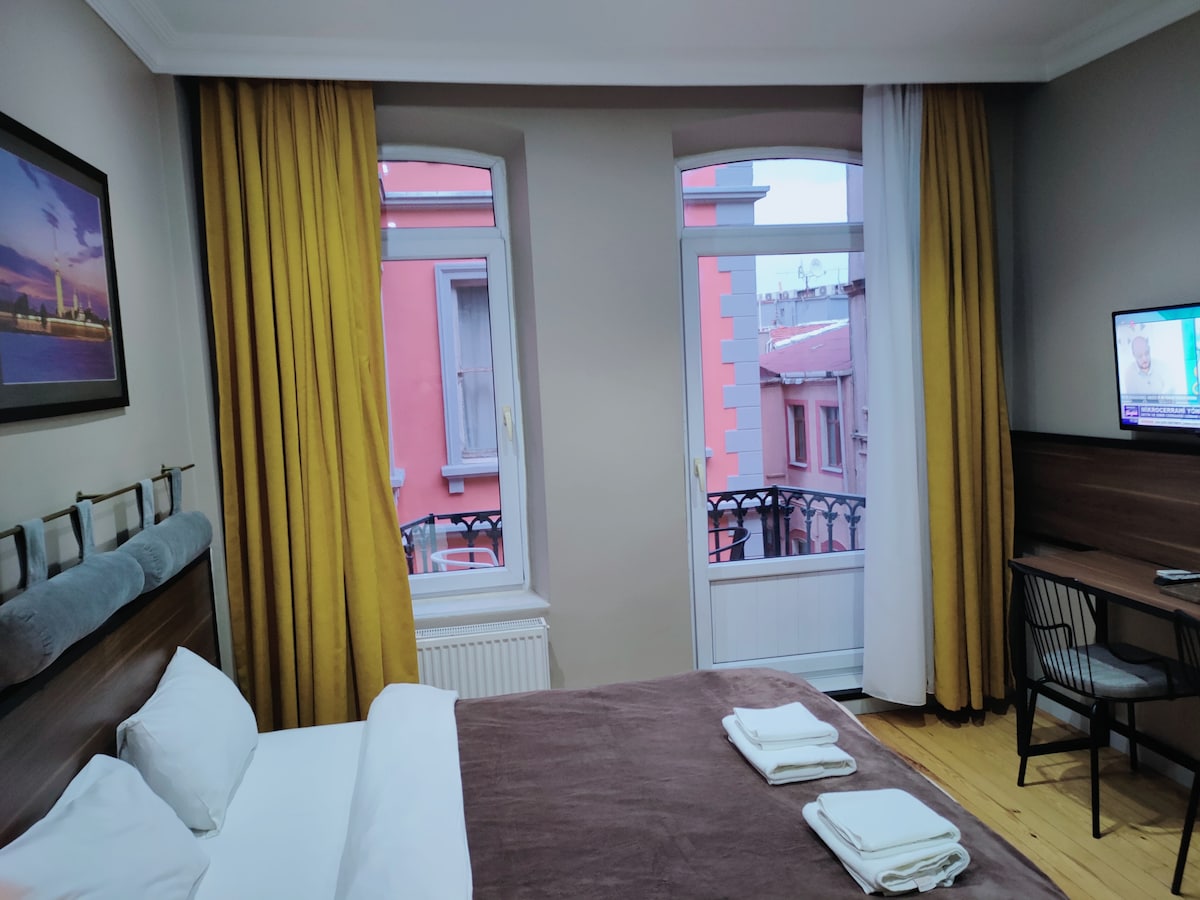 Our historical building is at Beyoglu/Taksim area. Consists total 9 separate rooms. This room is on 2nd floor (US citizens use it as 3rd floor) and keep in mind that there is no elevator. There is a small private balcony in and fully eqquipment with kettle, fridge, two set of glasses, complimentary a bottle of water and tea. It’s located in a popular old Greek area. You can easily reach to some supermarkets, cafes, restaurants, local shops, etc.. It’s 5 mins from Istiklal street by foot.