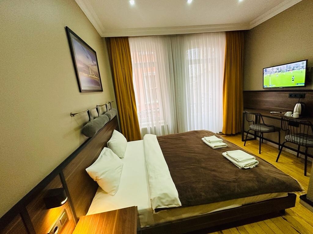 Our historical building is at Beyoglu/Taksim area. Consists total 9 separate rooms. This room is on 2nd floor (US citizens use it as 3rd floor) and keep in mind that there is no elevator. There is a small private balcony in and fully eqquipment with kettle, fridge, two set of glasses, complimentary a bottle of water and tea. It’s located in a popular old Greek area. You can easily reach to some supermarkets, cafes, restaurants, local shops, etc.. It’s 5 mins from Istiklal street by foot.