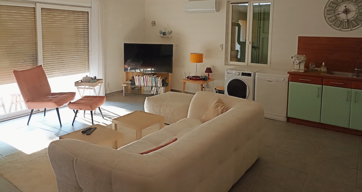 Charming 2 room apartment in a small town house. 8 mn walk from downtown Very close to the romain theater, to all shops. 2 rooms: one with bed 140, the other with bed 90 Kitchen area: Combined microwave oven, mini fridge, coffee maker, kettle; Washing machine dryer Bathroom wih bathtube Independent WC Very quiet. Cool in summer because it's an old house. You can park your car in front the house. Very secure.