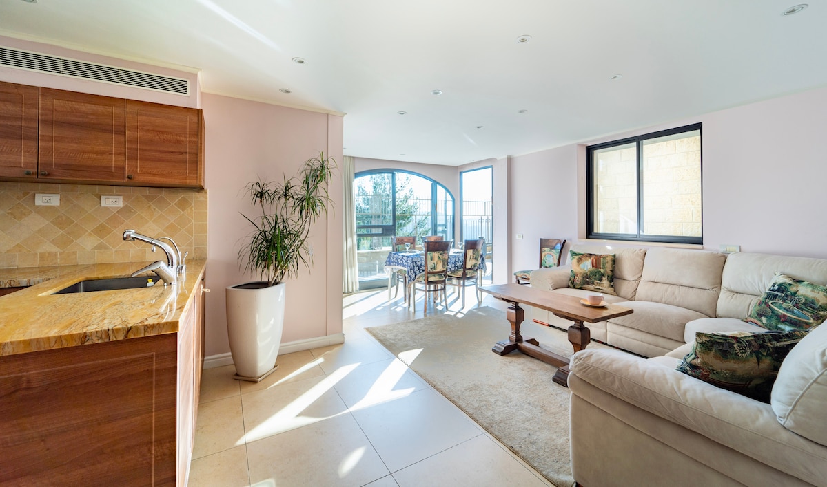 Truly unique, fully accessible luxury retreat in Har Nof. Lobby-level entry—no stairs to climb—private garden & porch with serene forest views, 5 floors above street. Fully equipped kosher l’mehadrin kitchen, steps from shopping, dining, and all types of shuls. Peaceful, elegant, sleeps 6, with optional add-on services to make your stay effortless.