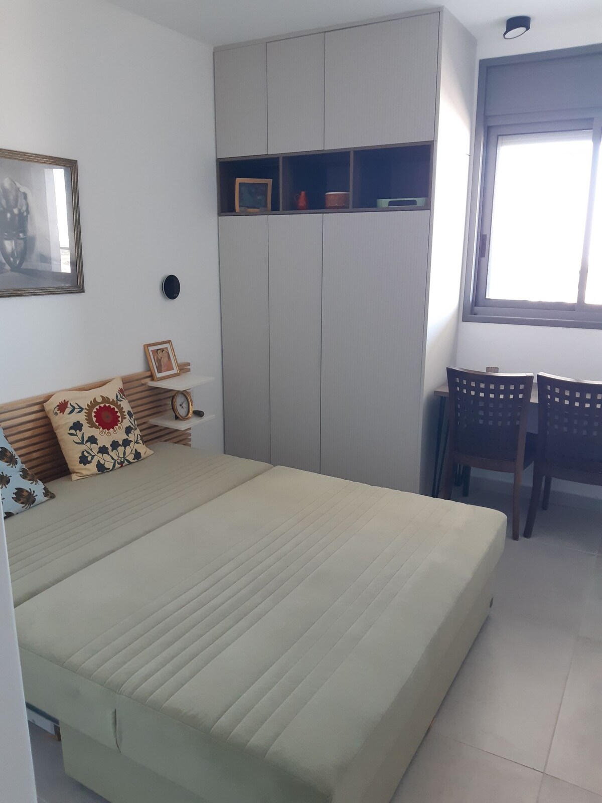 Our place is situated in our 250 sqm garden with an outdoor sitting place. The space is 9*3 metres, 27 sqm, located in a quiet neighberrhood with an easy access to go everywhere. There is a pizza, a supermarket and a grossery store near by. A wide park is in a minute walking distance for jogging and relaxing. Herzliya city center is in a 5 minutes walking distance. The place is decorated as a surfers cabin, the bed mesures are 140/190 cm.